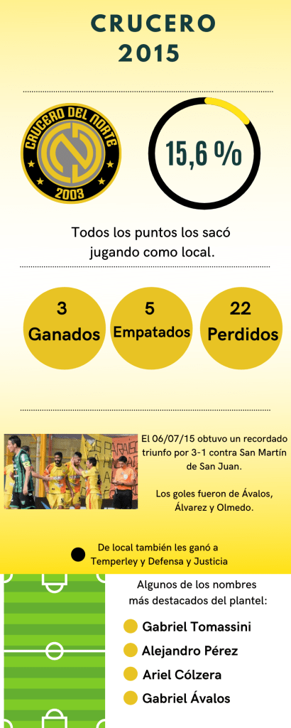 En el año 2015 Crucero fue el tercer equipo misionero en llegar a Primera y es el antecedente más cercano al momento de la redacción de este artículo (Agosto 2020). Sin embargo, la expectativa que generó se diluyó con el correr de una campaña con malos rendimientos y una presencia permanente en los puestos de descenso.
