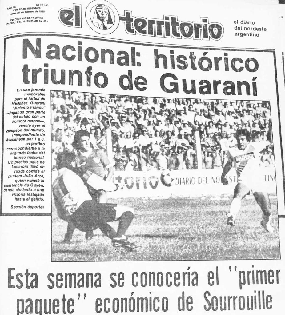 El debut fue el 17 de febrero de 1985 con un empate 1-1 en Parque de los Patricios contra Huracán. Una semana después, el 24, Guaraní consiguió el triunfo más importante de su historia. En Villa Sarita, los misioneros recibieron al Independiente campeón del mundo de Clausen, Trossero, Giusti, Burruchaga y muchas estrellas más (Bochini formaba parte del plantel pero no viajó a Posadas). Con un gol tempranero de “Palito” Arce a los cuatro minutos, los locales derrotaron a ese gran equipo “Rojo”, generando un batacazo resonante.