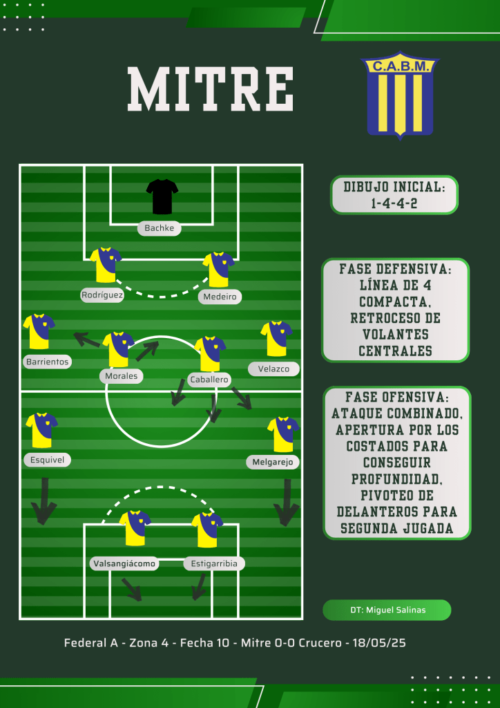 Mitre, en contrapartida, diseñó su andamiaje a partir de un doble 5 conformado por Morales y Caballero. Ambos iniciaban su posicionamiento detrás de la mitad de la cancha, se distribuían los pasillos centrales y allí intentaban recuperar la pelota. Al principio Caballero se adelantaba unos metros con la posesión a favor e intentaba enlazar, aunque con poca profundidad; por eso en el complemento fue Morales quien tomó ese rol, llevándolo mejor con más dinámica y distribución.